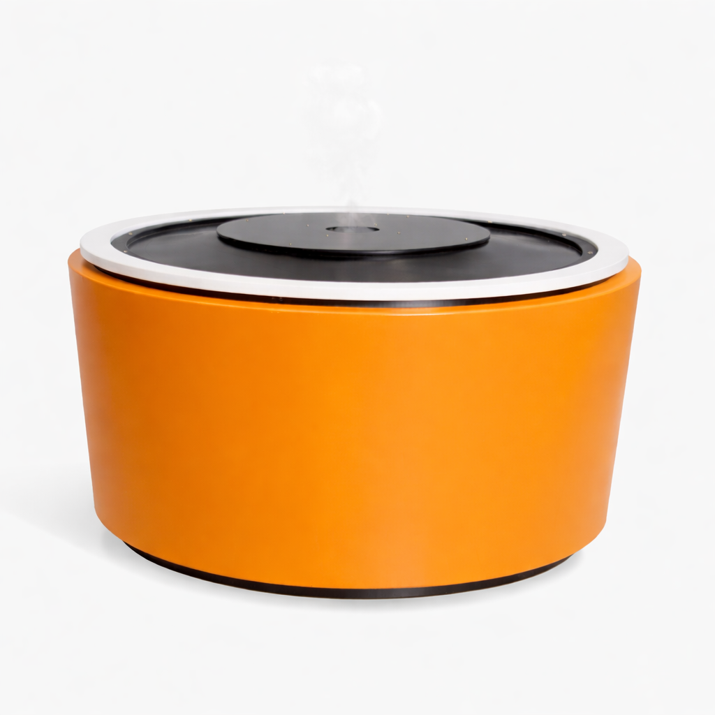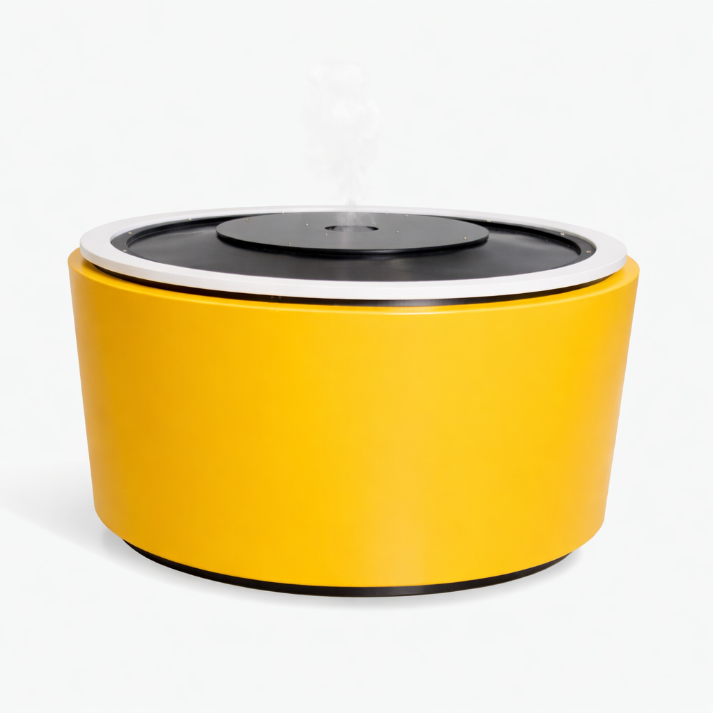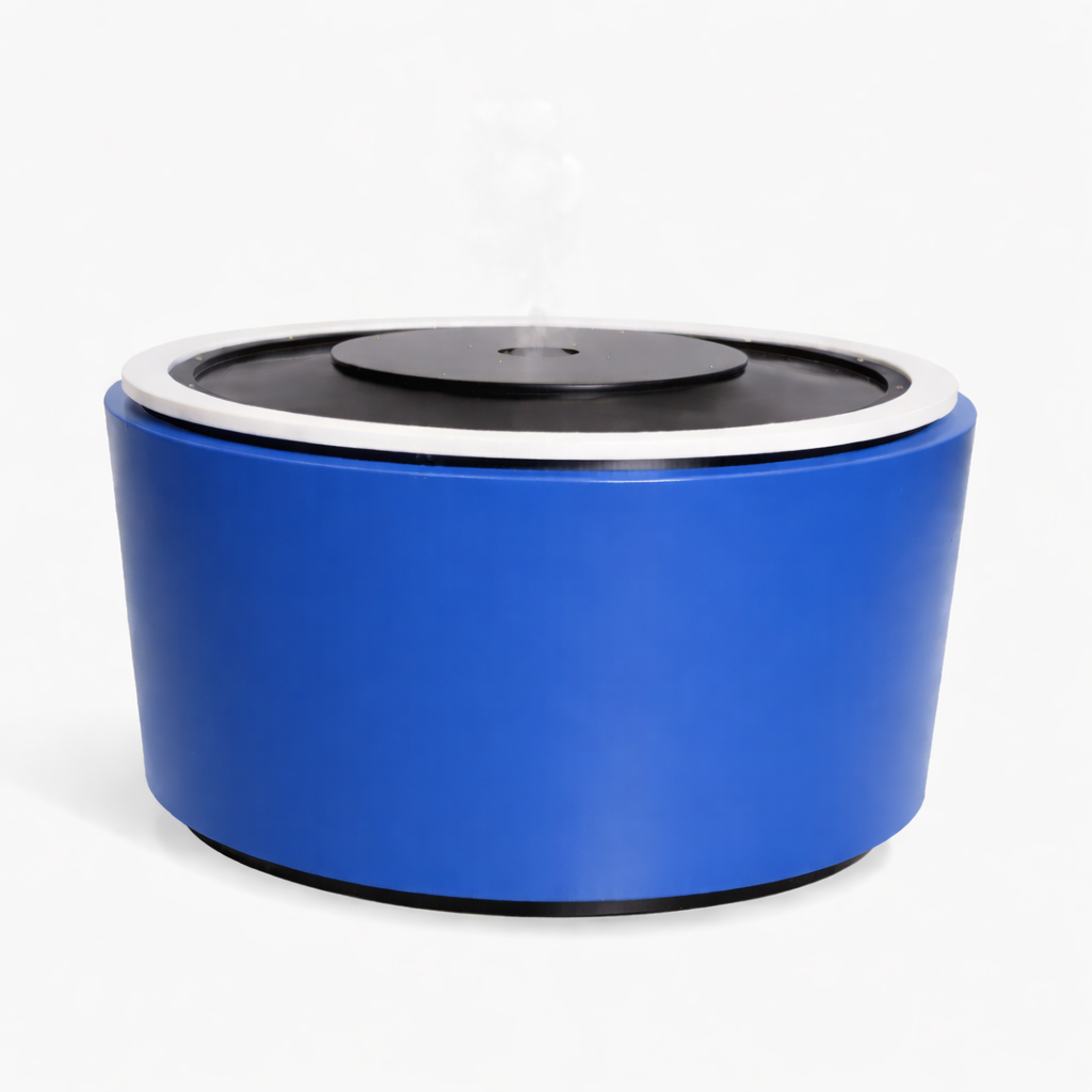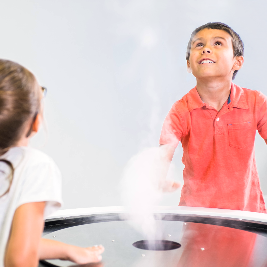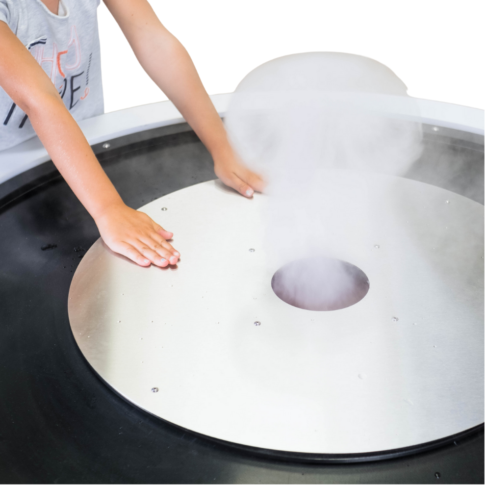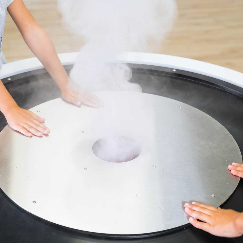 Launch fog rings into the air by pushing down on a flexible diaphragm suspended over a reservoir of water vapor. Air friction between the vapor and the hole’s edge creates a ring shaped swirling pattern known as a toroidal vortex. Experiment with how much force you apply to the membrane and how quickly you move to create different rings and observe the different effects of air friction, pressure, and fluid dynamics.
